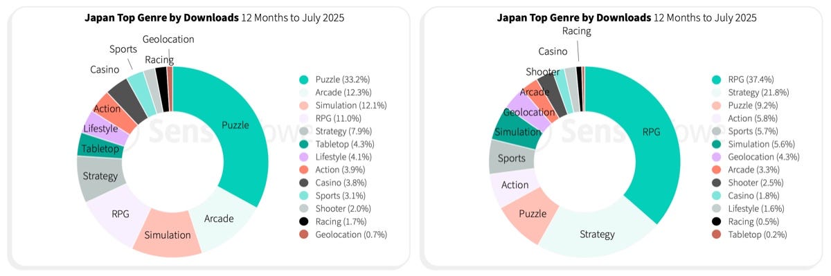 Puzzles (33.2%), arcades (12.3%), and simulators (12.1%) lead the Japanese market by downloads for the 12 months from August 2024 to July 2025.