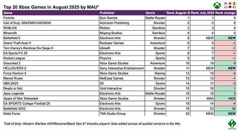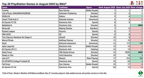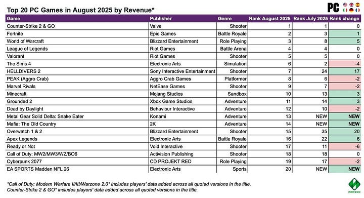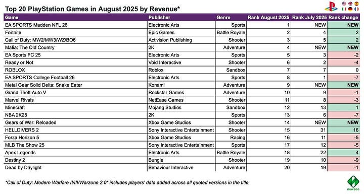 In August, three major new entries hit the top 20: EA Sports Madden NFL 26 (2nd place), Mafia: The Old Country (6th place), and Metal Gear Solid Delta: Snake Eater (15th place).