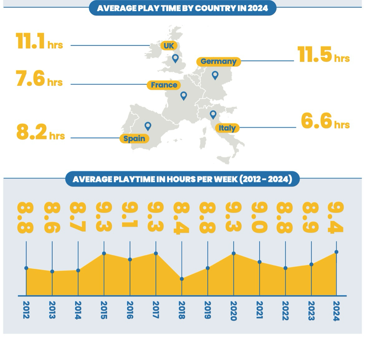 Interestingly, 2024 set a record since 2012 (when tracking began) for average weekly playtime. People now play an average of 9.4 hours per week.
