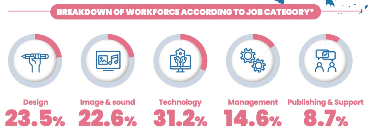 23.3% of all employees are in management, publishing, or customer support. The rest are directly involved in development.