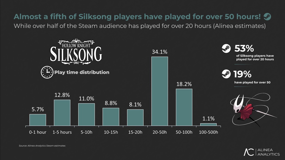 Hollow Knight Silksong has been purchased more than 3.5 million times on Steam; overall, more than 6 million people have played the game (including Game Pass players). More than half of the Steam owners have spent over 20 hours playing. Data from Alinea Analytics.