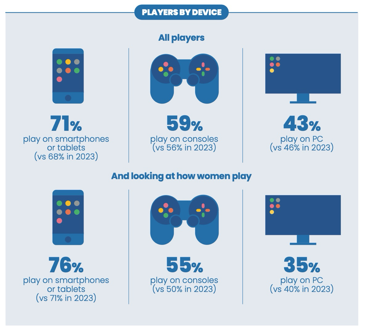 People played more on smartphones and consoles in 2024 compared to 2023, and less on PC. Interestingly, this contrasts with the growing PC platform revenue.