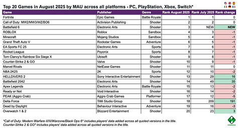 Newzoo: Top 20 PC/Console Games by Revenue and MAU (August’25)