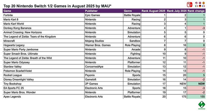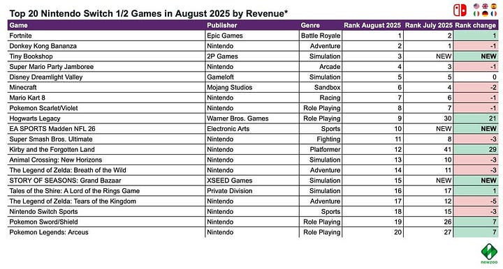Nintendo Switch saw three new entries in the top 20: Tiny Bookshop (3rd place), EA Sports Madden NFL 26 (10th place—highlighting very different audience preferences), and Story of Seasons: Grand Bazaar (15th place).