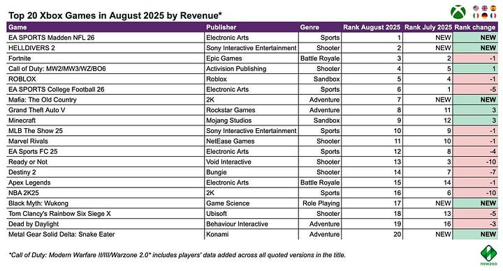 Helldivers II had a strong debut on Xbox, taking 2nd place by revenue in August, behind only EA Sports Madden NFL 26.