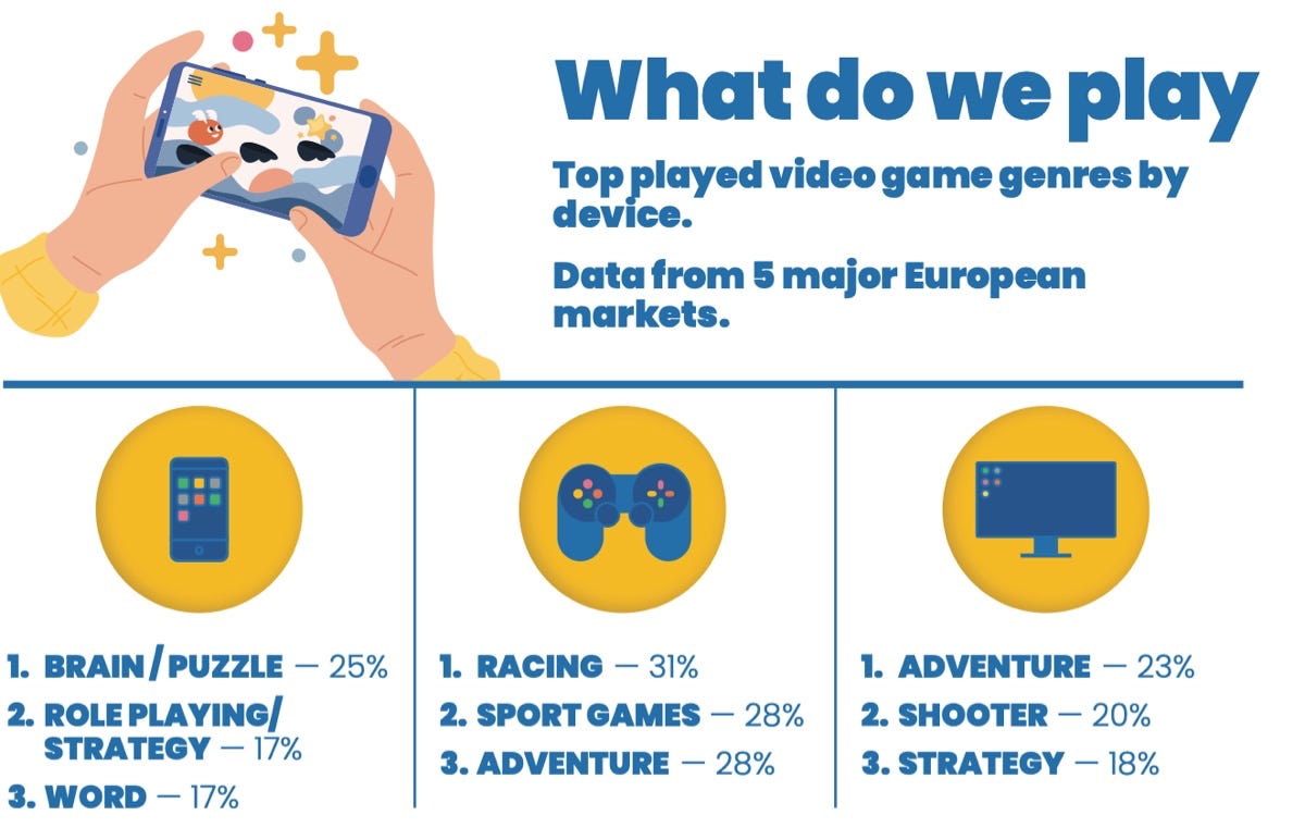 Top mobile genres in the 5 biggest European markets are puzzle (25%), RPG & strategy (17%), and word games (17%). On consoles, players mostly play racing (31%), sports (28%), and adventure (28%). On PC, adventure (23%), shooters (20%), and strategy (20%) dominate.
