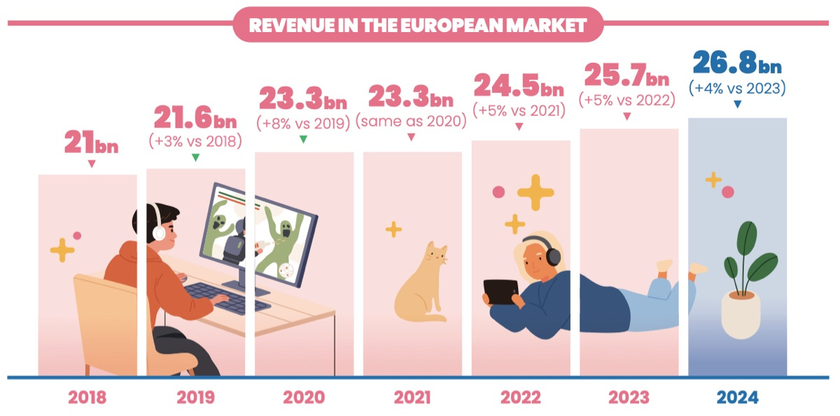 Revenue of the European game market continues to grow. In 2024, the European markets reached €26.8 billion (+4% YoY).