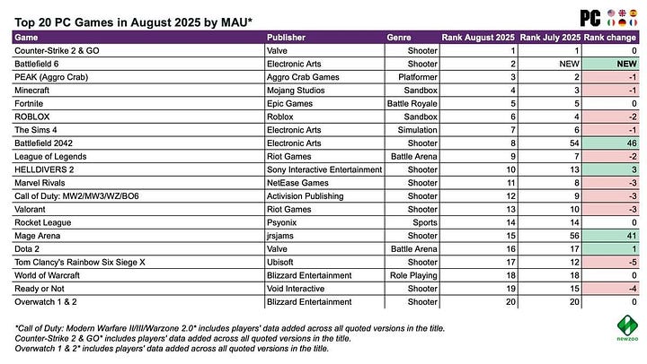 There was unusually high movement in the MAU rankings. First, Battlefield 6 entered the overall chart in 3rd place—and that’s just the beta. On the back of its popularity, Battlefield 2042 also climbed back into the top 20.