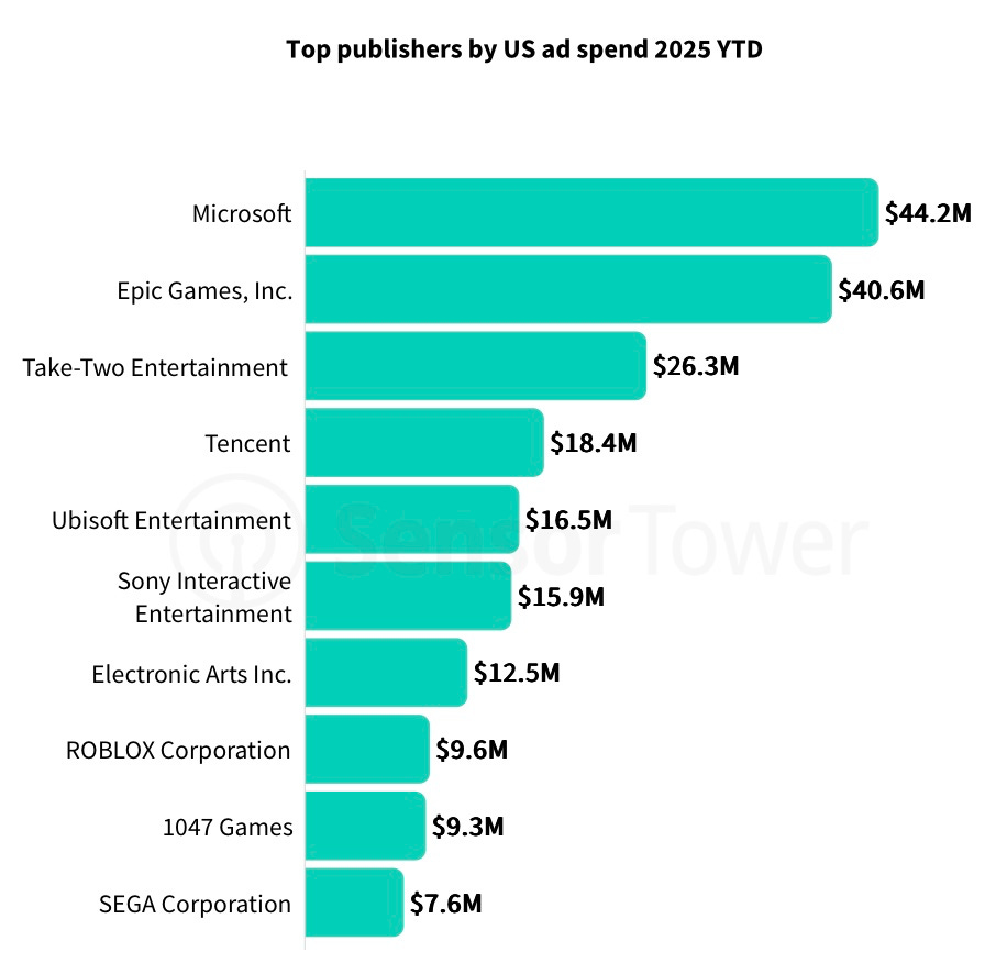 Microsoft spent the most on advertising in the US during this period - $44.2 million. They’re followed by Epic Games ($40.6 million) and Take-Two ($26.3 million).