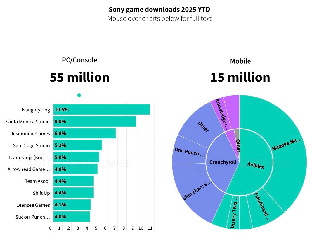 Sony’s mobile footprint is much smaller: mobile downloads are nearly 4x fewer than its PC and console installs.