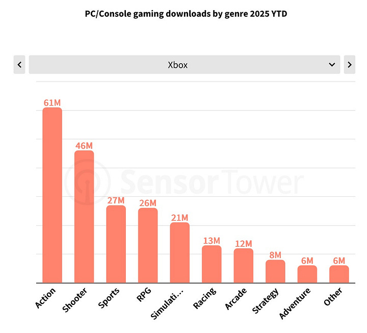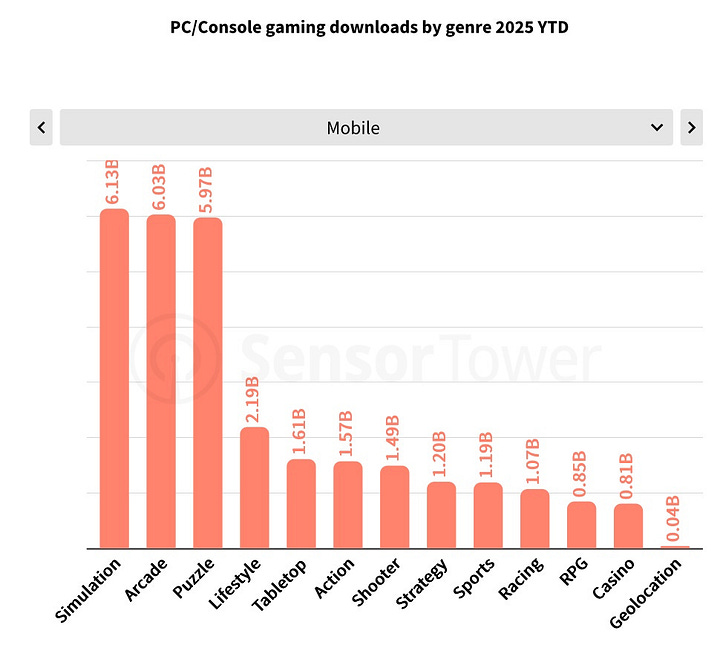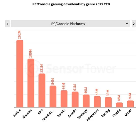 Action, shooters, and RPGs are the most popular genres on PC and consoles by downloads. Sports titles also perform strongly on consoles. On mobile, however, top genres are simulators, arcades, and puzzles, a very different split.