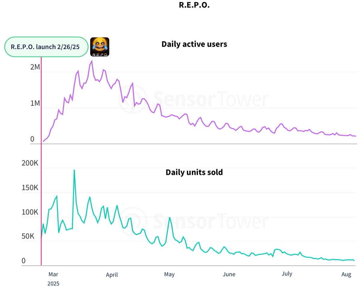 Another success story is R.E.P.O. - it grew strongly due to virality, retaining over 200K DAU after 5 months. The game sold 50K+ copies right at launch, an excellent start for an indie project.