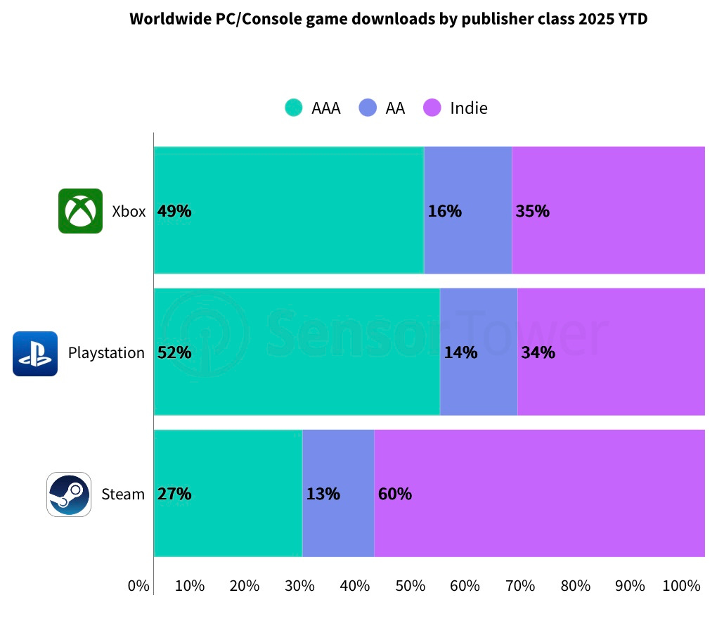 Looking at scale, Steam is the main platform for indie developers by downloads: 60% of Steam downloads are indie titles, compared to 34–35% on PlayStation and Xbox.