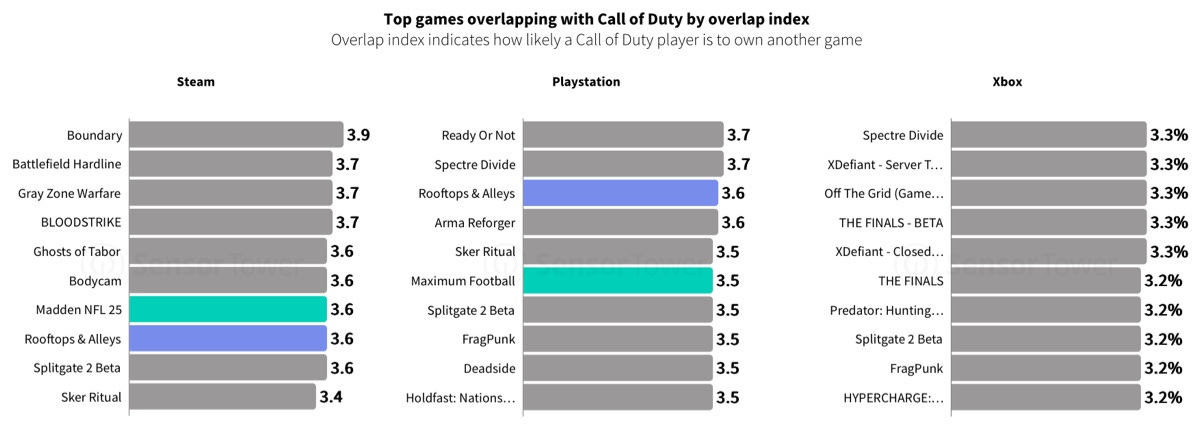 Call of Duty players are most likely to also engage with other shooters, American football, and…Rooftops & Alleys: The Parkour Game.