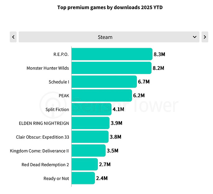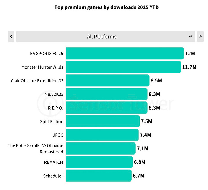 EA Sports FC 25 (12M copies), Monster Hunter Wilds (11.7M), and Clair Obscur: Expedition 33 (8.5M installs) were the top premium titles by downloads in 2025.