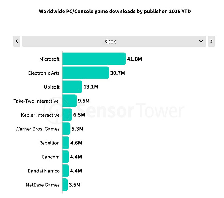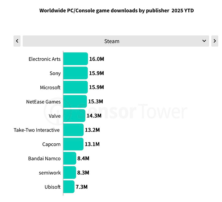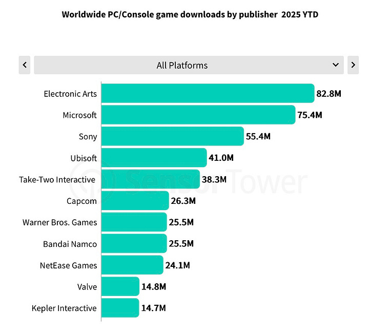 Electronic Arts was the most popular publisher from January to August 3, 2025, with 82.8 million downloads. For comparison, Microsoft had 75.4 million and Sony had 55.4 million. EA’s number will grow by year-end thanks to major sports releases traditionally dropping in late summer–early fall.