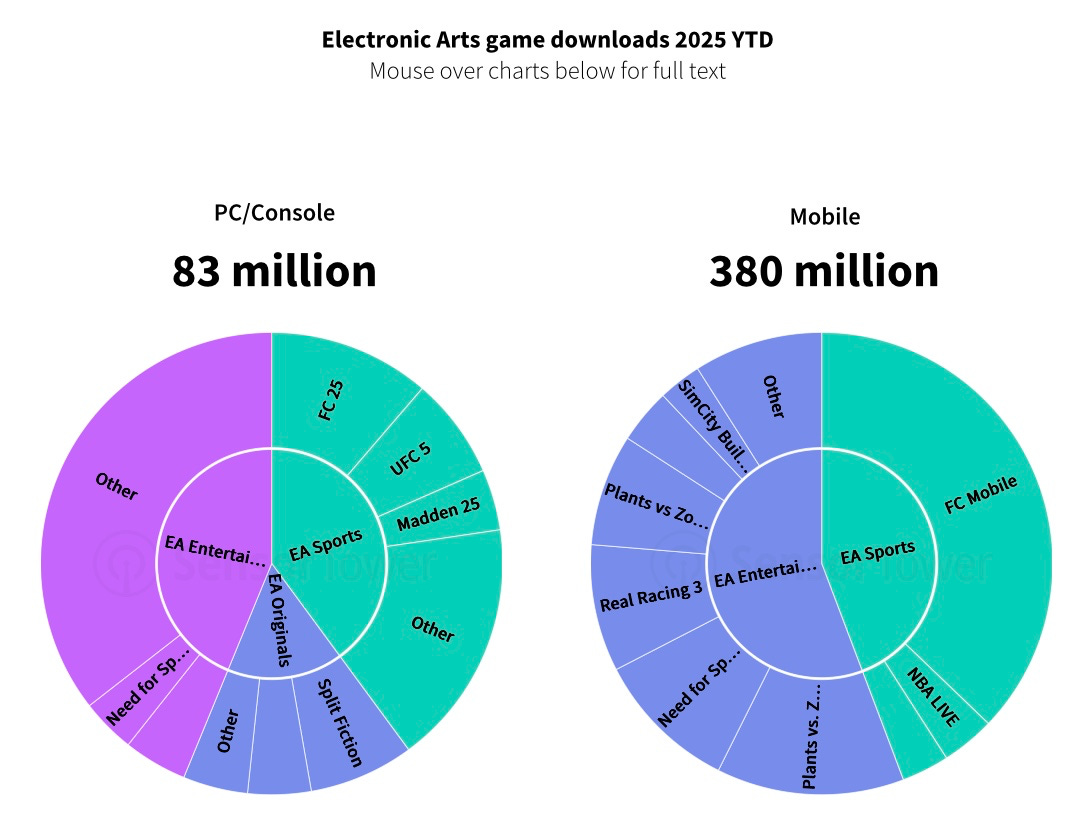 Besides strong PC/console performance (downloads include purchases), EA’s mobile business is also doing well, with 380+ million downloads in just over 7 months of 2025.