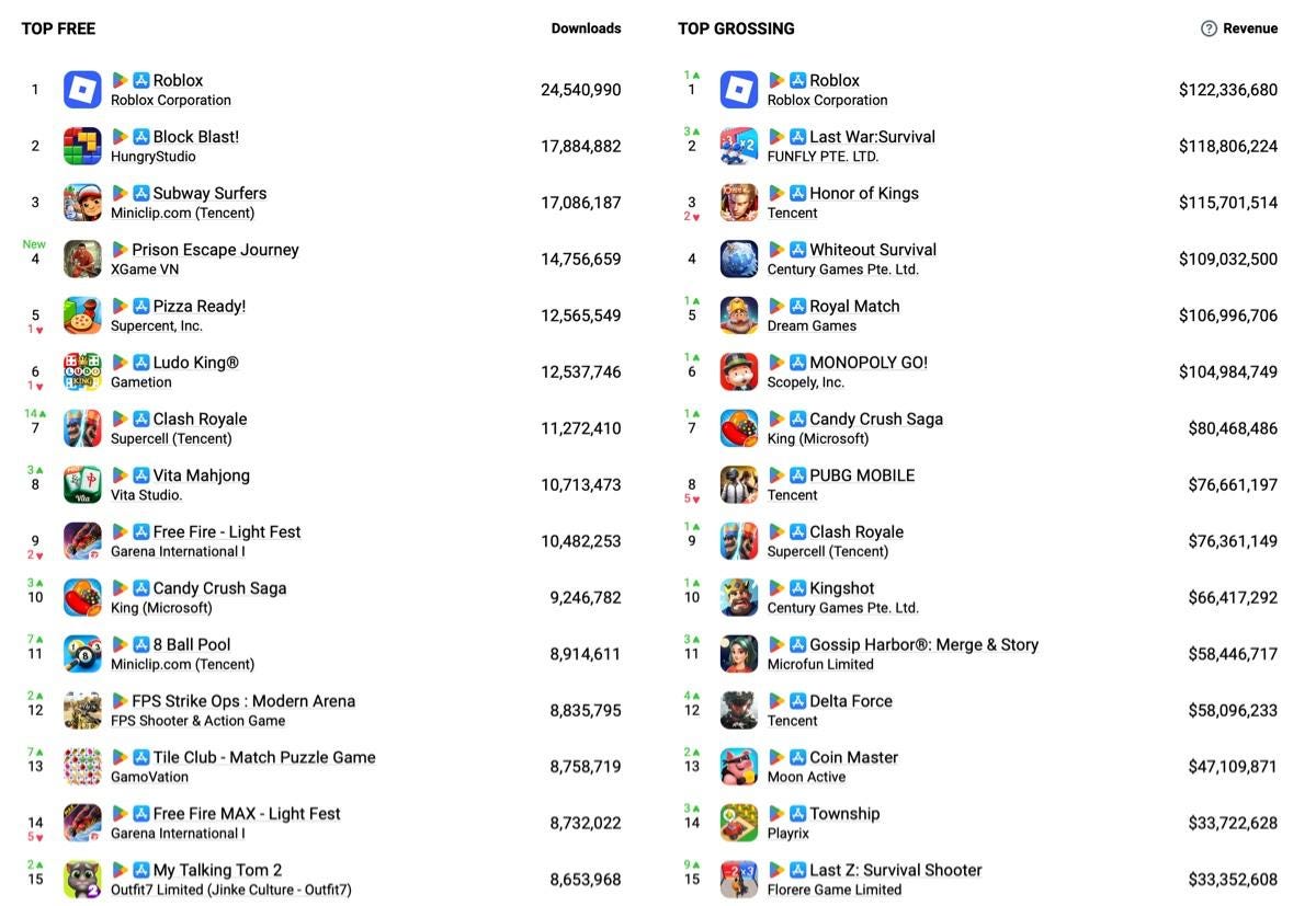 The top three by downloads remain unchanged - Roblox (24.5 million), Block Blast! (17.8 million), and Subway Surfers (17 million).