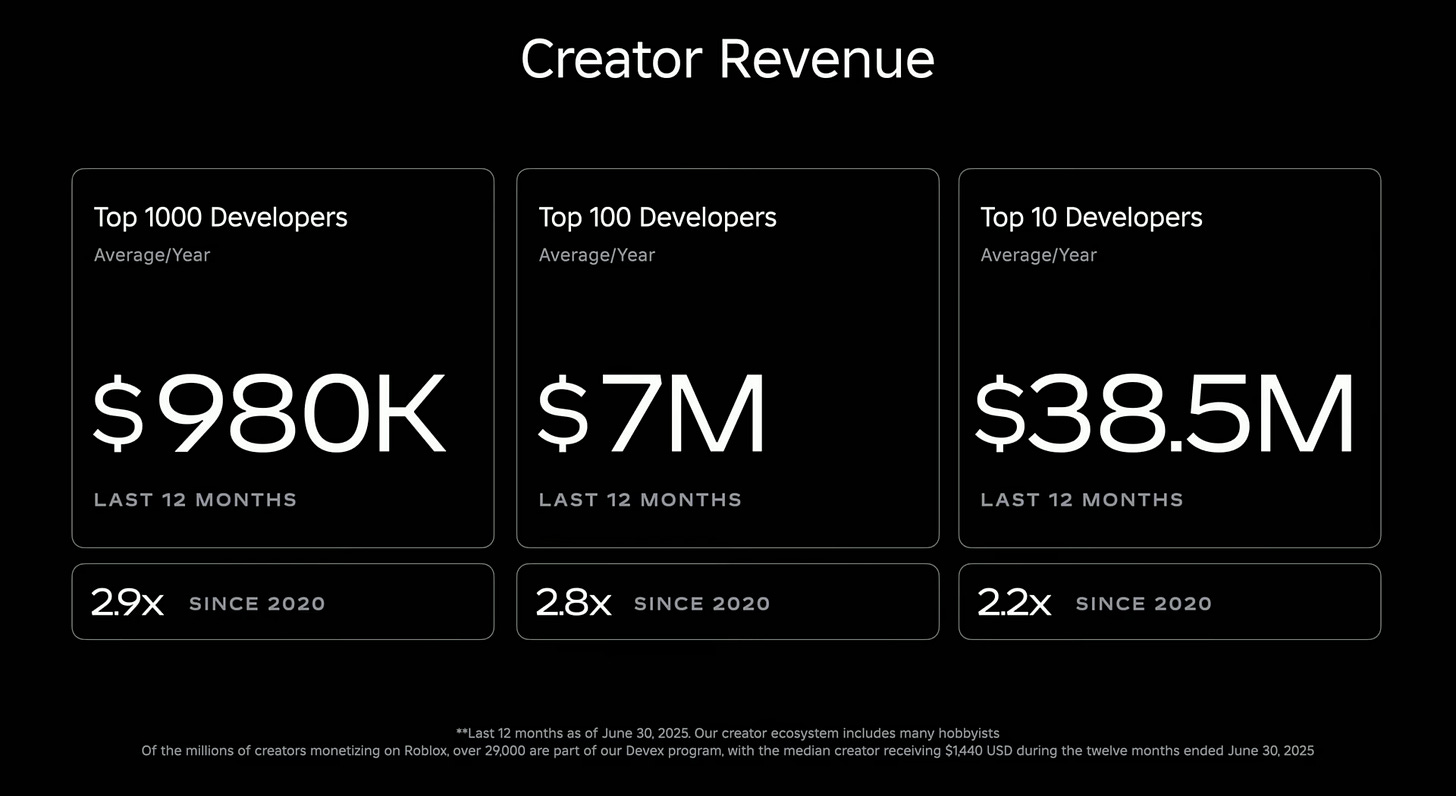 Finally, the top 10 developers on Roblox earn on average $38.5 million annually. That’s 2.2 times more than five years ago.
