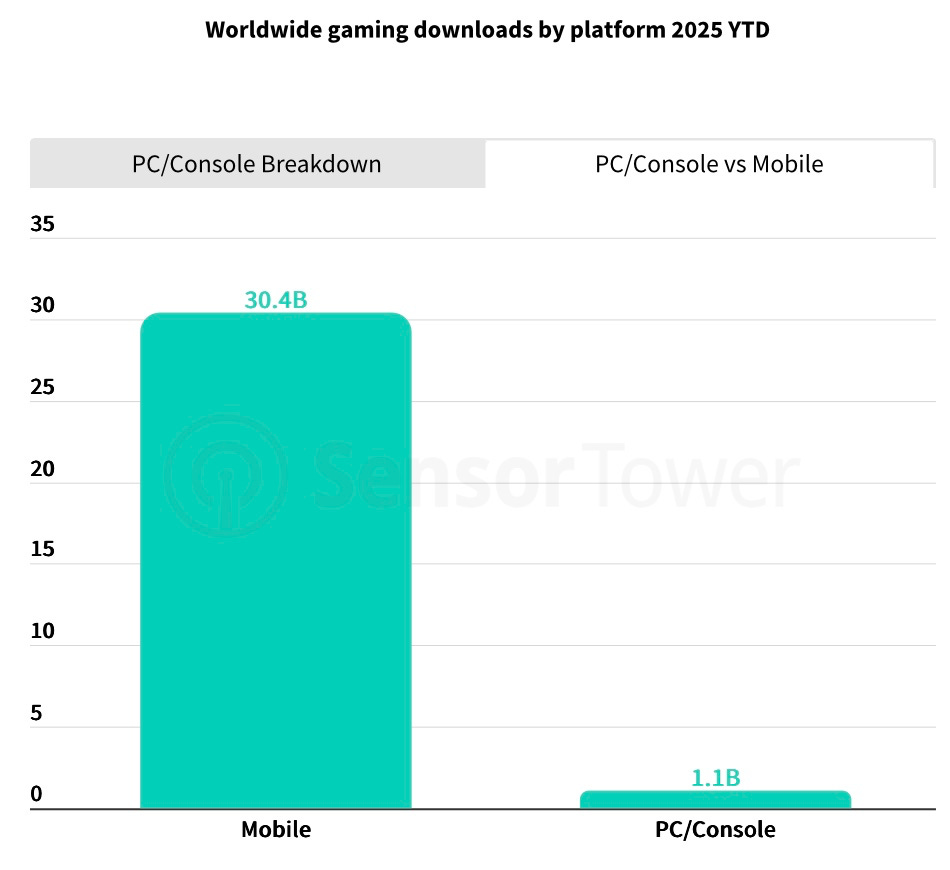 That 1.1 billion downloads may look like a big number on paper, but compared to 30.4 billion mobile installs in the same period, it is relatively small. However, a significant portion of PC and console downloads are paid games.