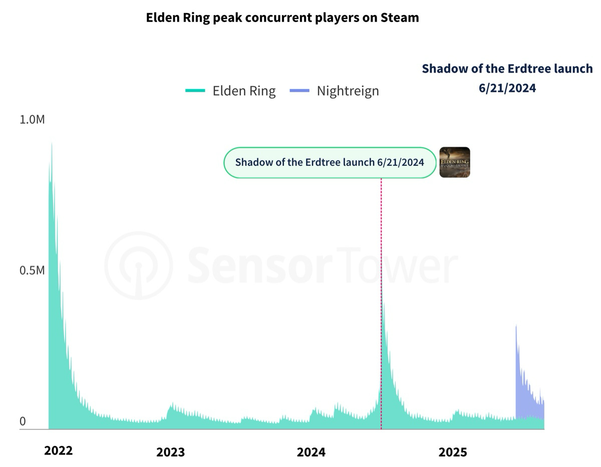 VGI and Sensor Tower highlight franchise power. For example, the Shadow of the Erdtree update brought back more than half of Elden Ring’s launch CCU. Meanwhile, Elden Ring Nightreign, though smaller in CCU, seems to keep retention better.