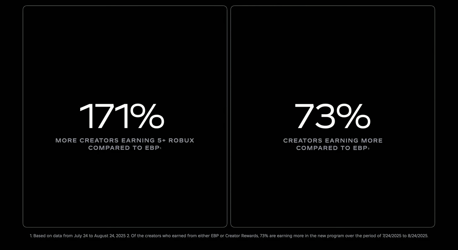 On July 24, 2025, Roblox replaced EBP (Engagement-Based Payouts) with the Creator Rewards program. The difference is that previously payouts were based on the time paying users spent in a game, while now the platform considers multiple factors – such as user activation or re-activation, whether the game is among the first three visited by the user that day, and more.