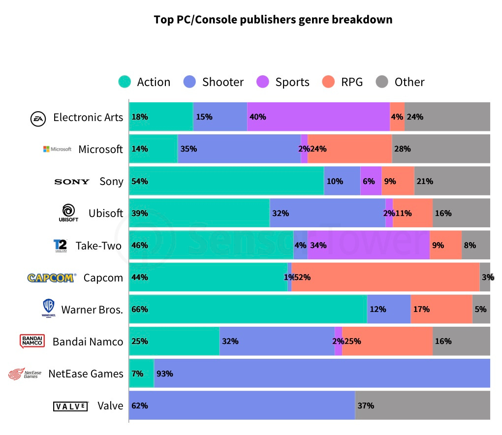 Most leading publishers are diversified, although some specialize (EA – sports, Capcom – RPG). NetEase is an outlier, with 93% of revenue coming from shooters.