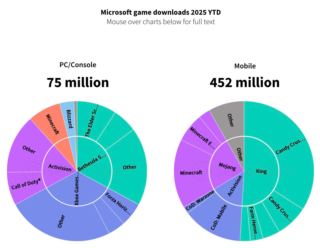 Microsoft shows a similar picture: 75 million PC/console installs plus 452 million on mobile, with more than half from King titles.