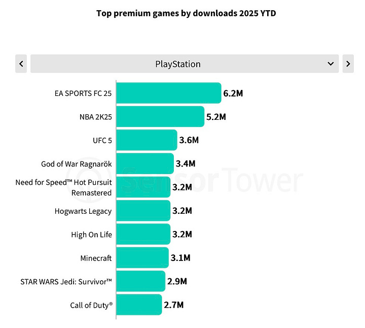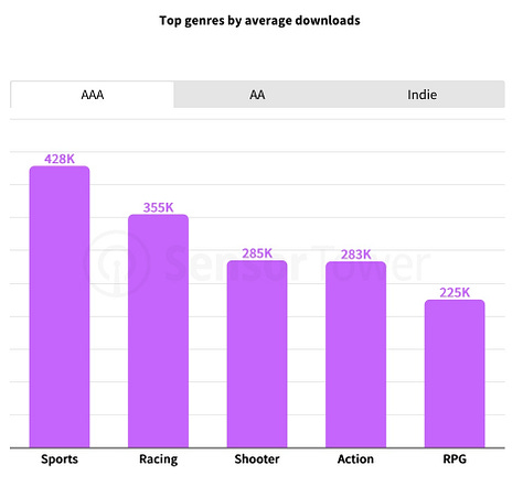 Among AAA games, sports titles (EA Sports FC, NBA 2K, UFC), racing (Forza, Need for Speed, F1), and shooters lead in average downloads.