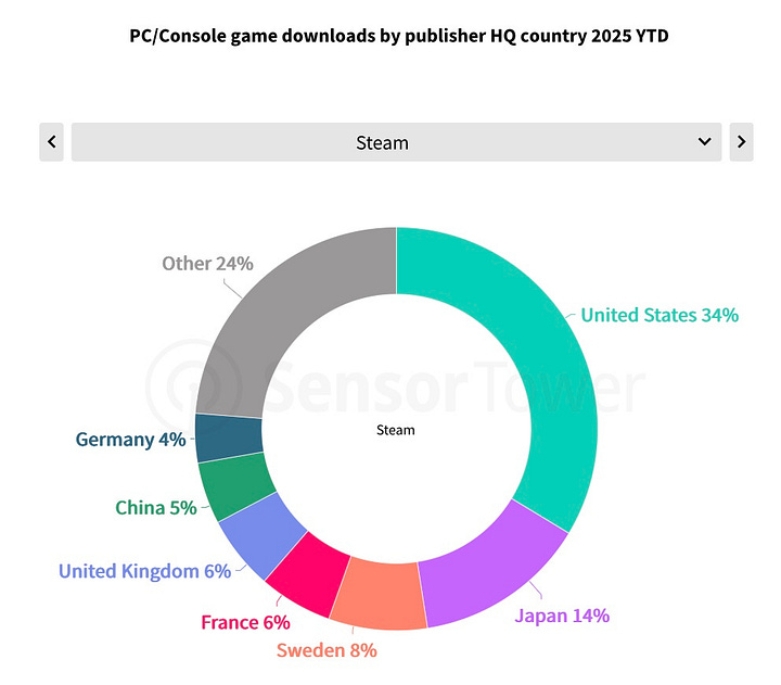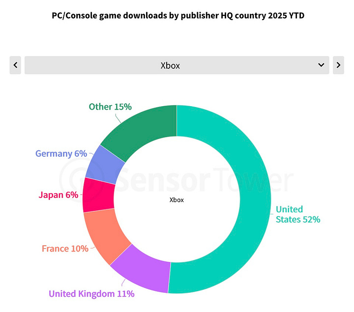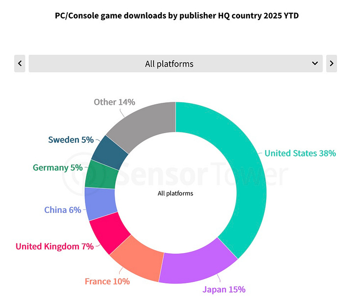Regionally, US publishers dominate with 38% of all PC/console downloads. Japan holds 15%, and France 10%.