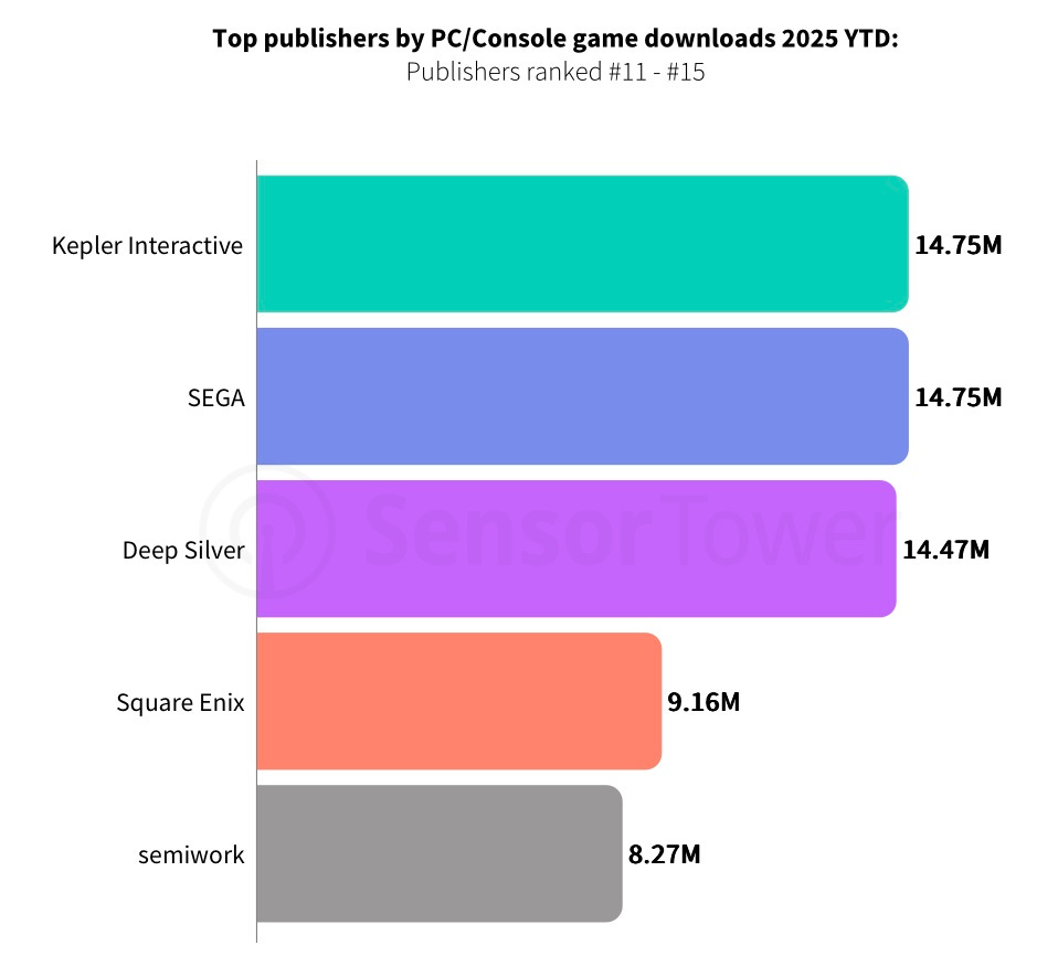 Outside the top 10, publishers with strong download figures include Kepler Interactive (14.75 million), SEGA (same), Deep Silver (14.47 million), Square Enix (9.16 million), and unexpectedly semiwork, creators of R.E.P.O (8.27 million).