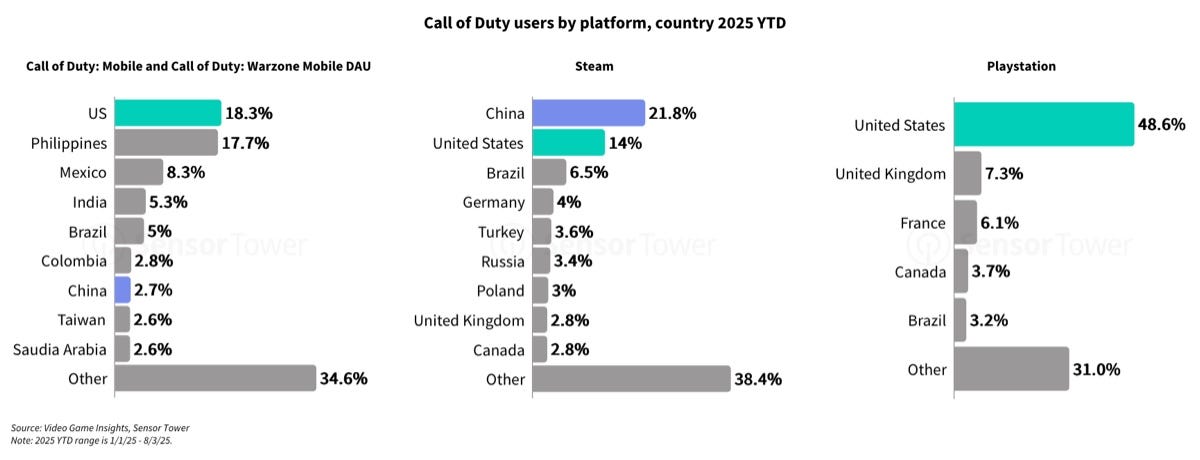 On mobile DAU, the US (18.3%), the Philippines (17.7%), and Mexico (8.3%) lead. On PlayStation, US players dominate (48.6%). On Steam, China is #1 with 21.8% DAU, followed by the US at 14%.