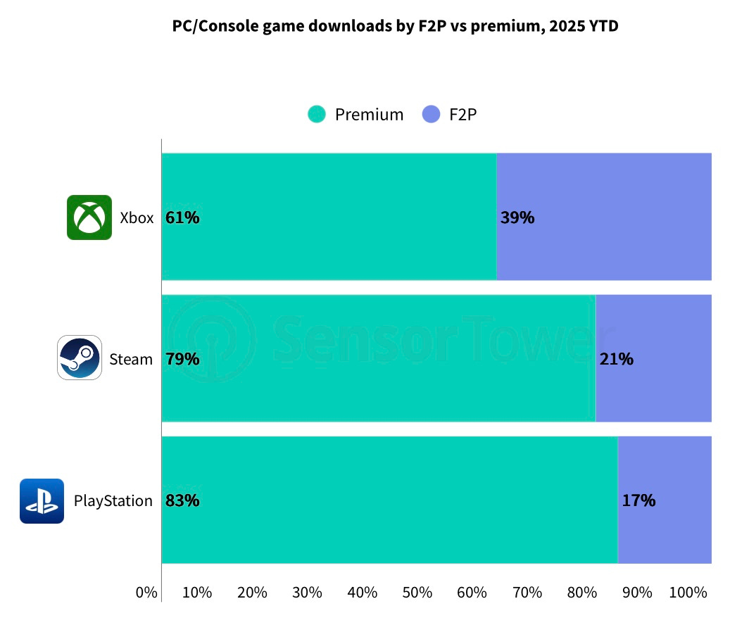 According to Sensor Tower, the share of F2P titles by downloads is: PlayStation – 17%; Steam – 21%; Xbox – 39%. The rest are paid projects. Slightly surprising, considering the dominance of Fortnite, Roblox, CS 2, and other live-service heavyweights.