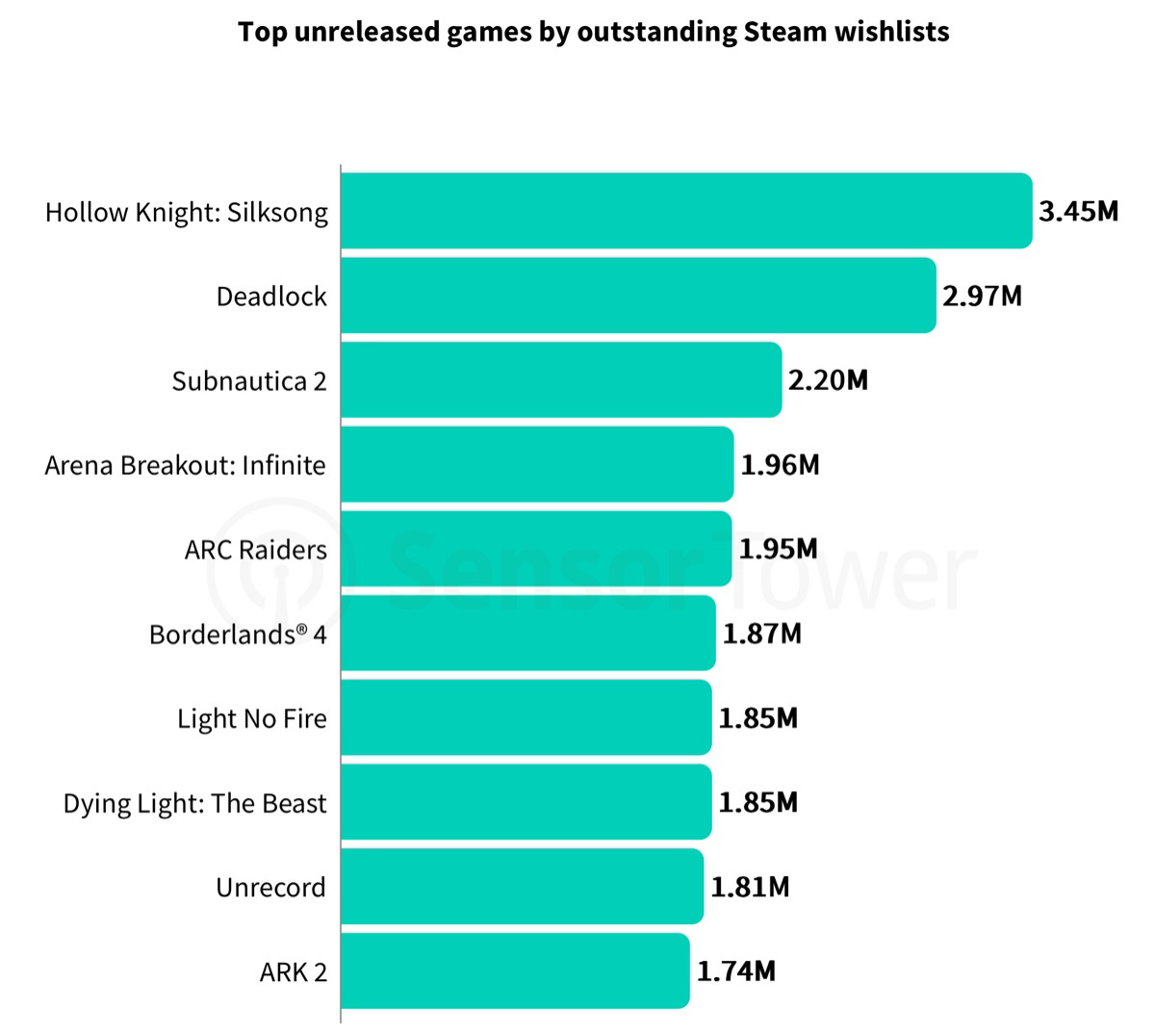 As of writing, Hollow Knight: Silksong hasn’t been released yet, making it the most wishlisted project on Steam. Other big wishlist titles include Deadlock (2.97M), Subnautica 2 (2.2M), and Arena Breakout: Infinite (1.96M, already out too).