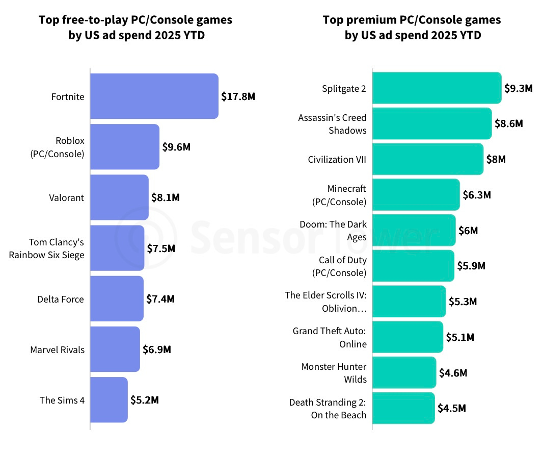 Among F2P titles, top US ad spenders were Fortnite ($17.8M), Roblox ($9.6M – PC/console only), and Valorant ($8.1M). For premium projects, Splitgate 2 ($9.3M), Assassin’s Creed Shadows ($8.6M), and Civilization VII ($8M) led the way.
